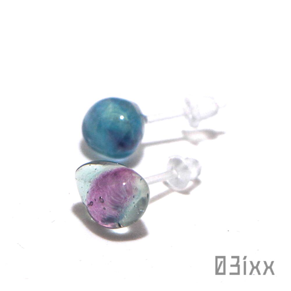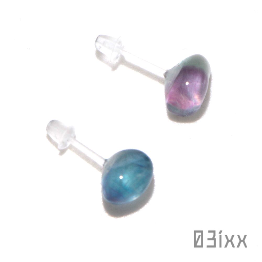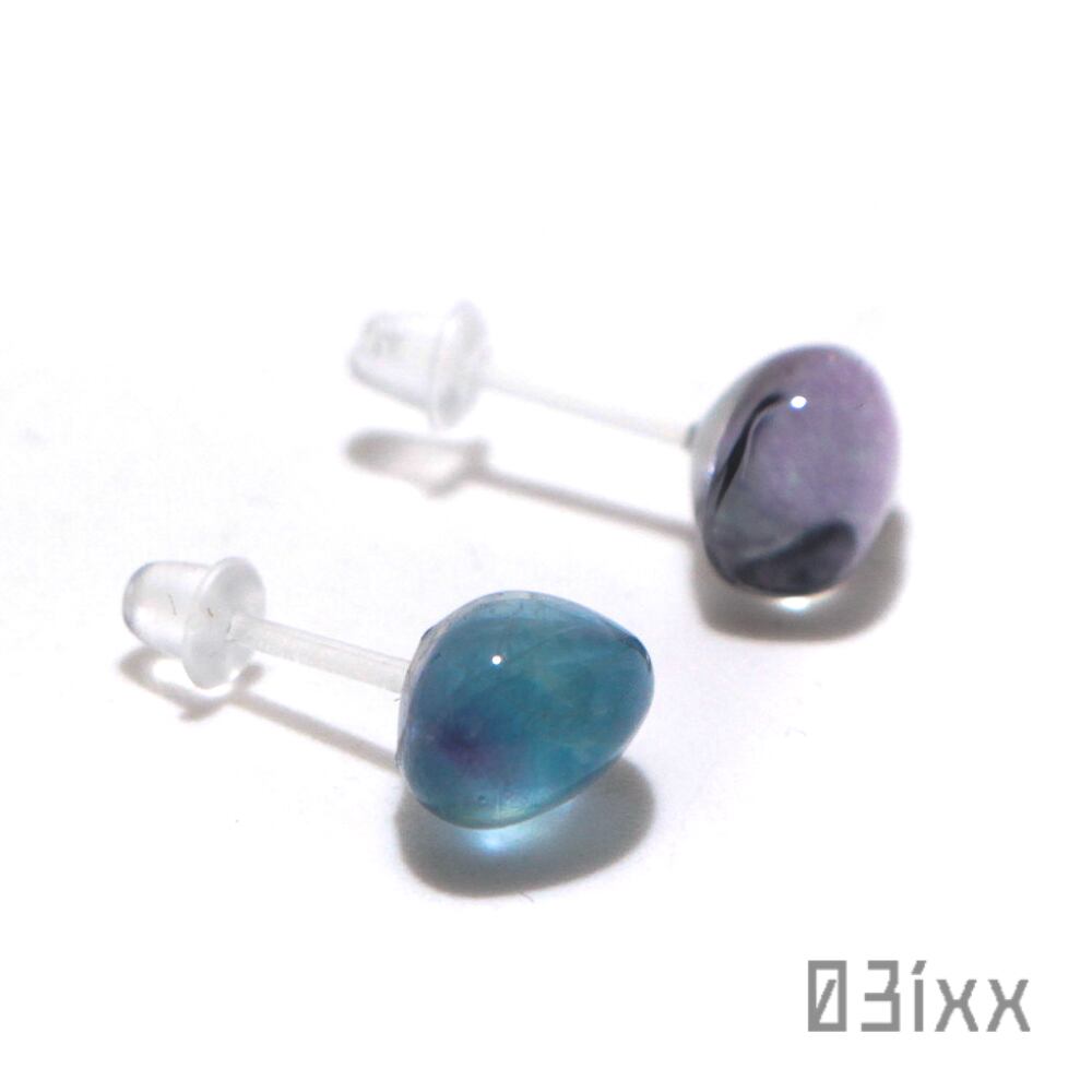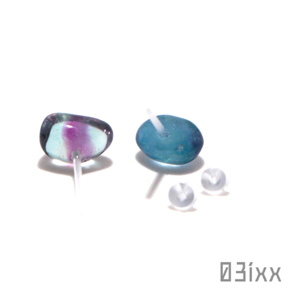 N040ピアス 天然石 フローライト 小粒 つやつや アシンメトリー 樹脂ピアス アレルギー対応