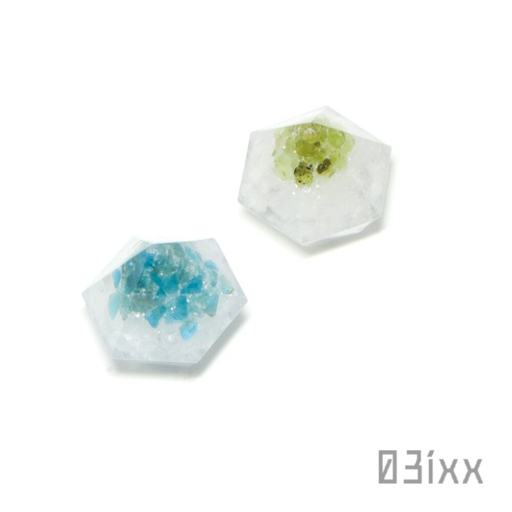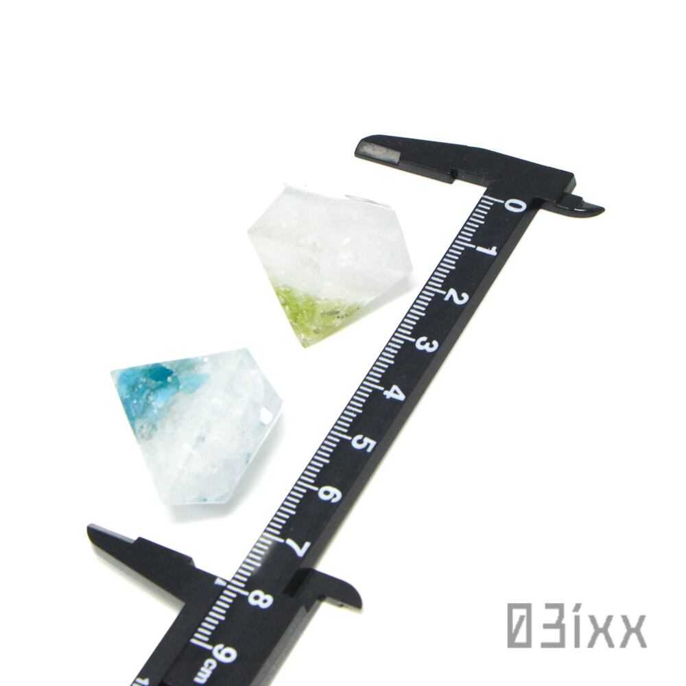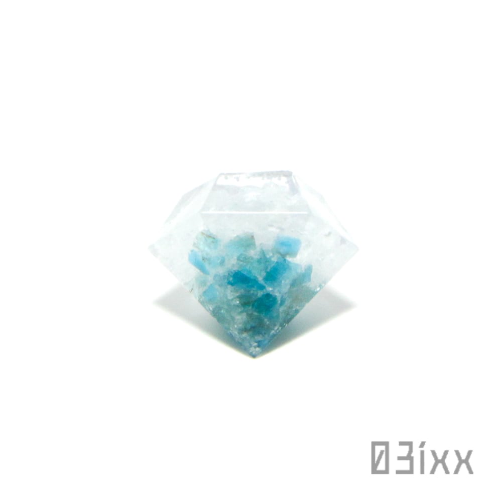 パキスタン産ホワイト岩塩をレジンで固めたダイヤ型盛塩の上部に天然石を封入し、